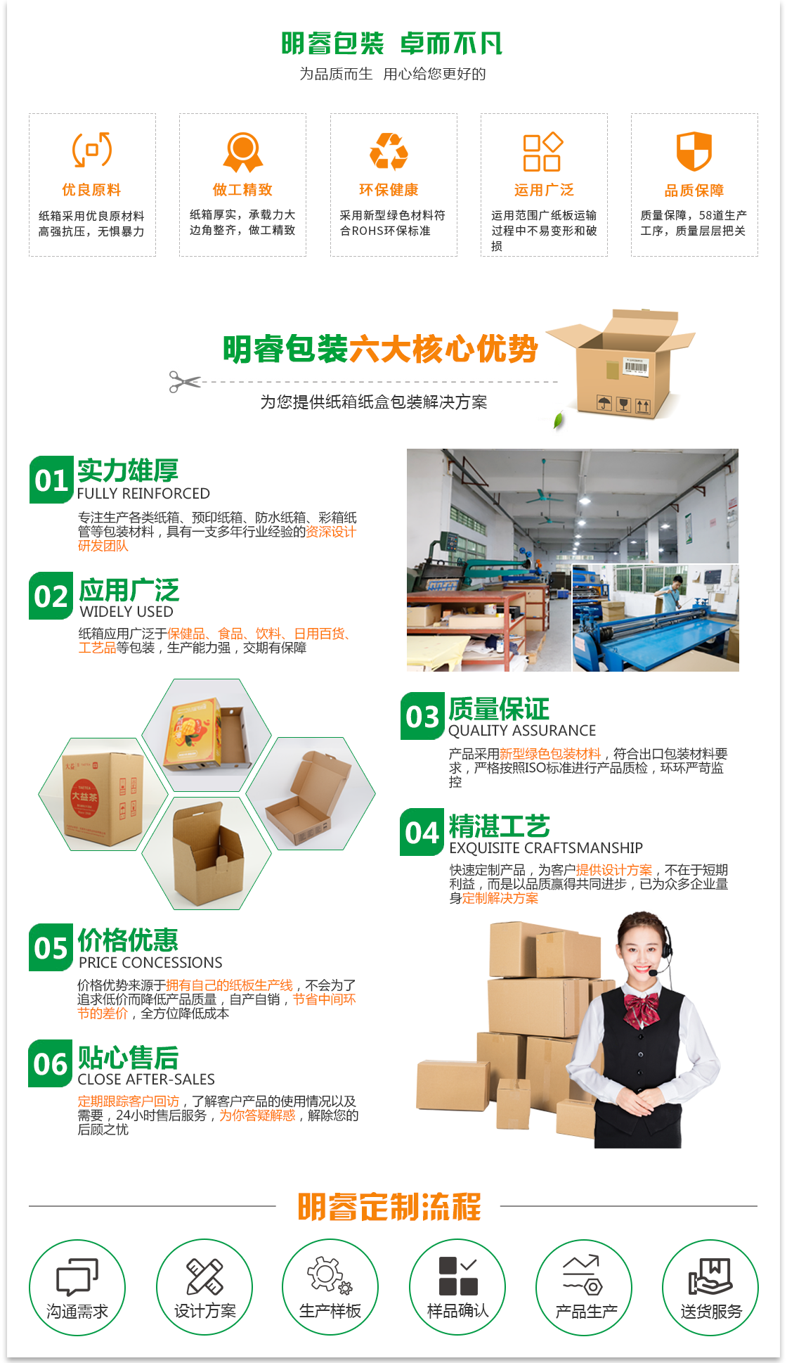 東莞市明睿包裝材料有限公司成立于2015年,位于中國制造業(yè)名城----東莞,工廠地址位于廣東省東莞市東城街道柏洲邊新田街13號2棟,環(huán)境優(yōu)美,交通便利 本公司專業(yè)生產(chǎn)各類紙箱、預(yù)印紙箱、防水紙箱、彩箱、彩盒、啤盒、刀卡、紙護角、紙管等包裝材料。主要生產(chǎn)設(shè)備:高速印刷機一臺,全自動粘釘一體機一臺,三色開槽印刷機一臺,半自動糊箱機兩臺,啤機一臺,打角機一臺,高速單刀分紙機一臺,碗刀分紙機1臺,釘箱機兩臺。主要客戶有食品、電子、五金、玩具等知名企業(yè)。自創(chuàng)立以來一貫秉承:專業(yè)、認真、快,信守承諾,以人為本,客戶至上,追求卓越的經(jīng)營理念...[查看詳情]